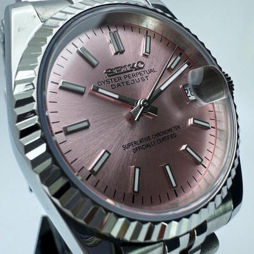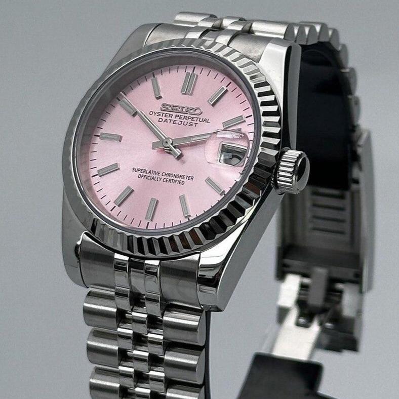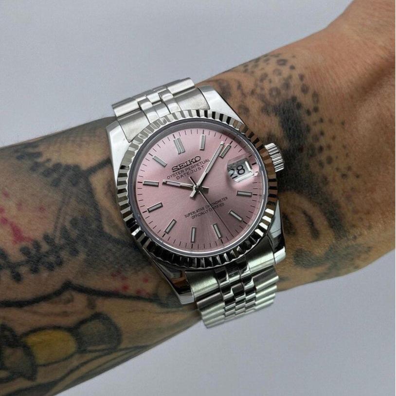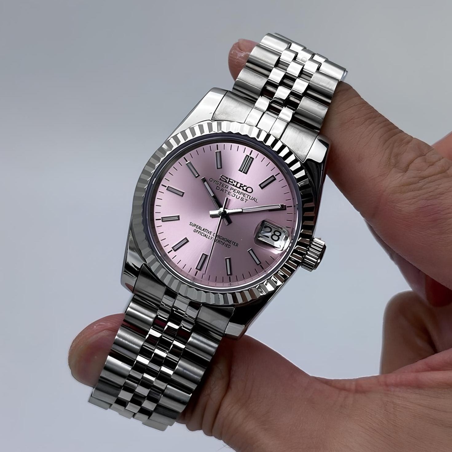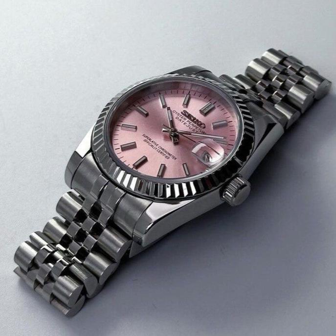 El Datejust Infini Pink Vardemir SeikoMod es una declaración de estilo y refinamiento. Su esfera rosa con infinitos reflejos encarna delicadeza y modernidad, capturando la luz para ofrecer matices sutiles y sofisticados.