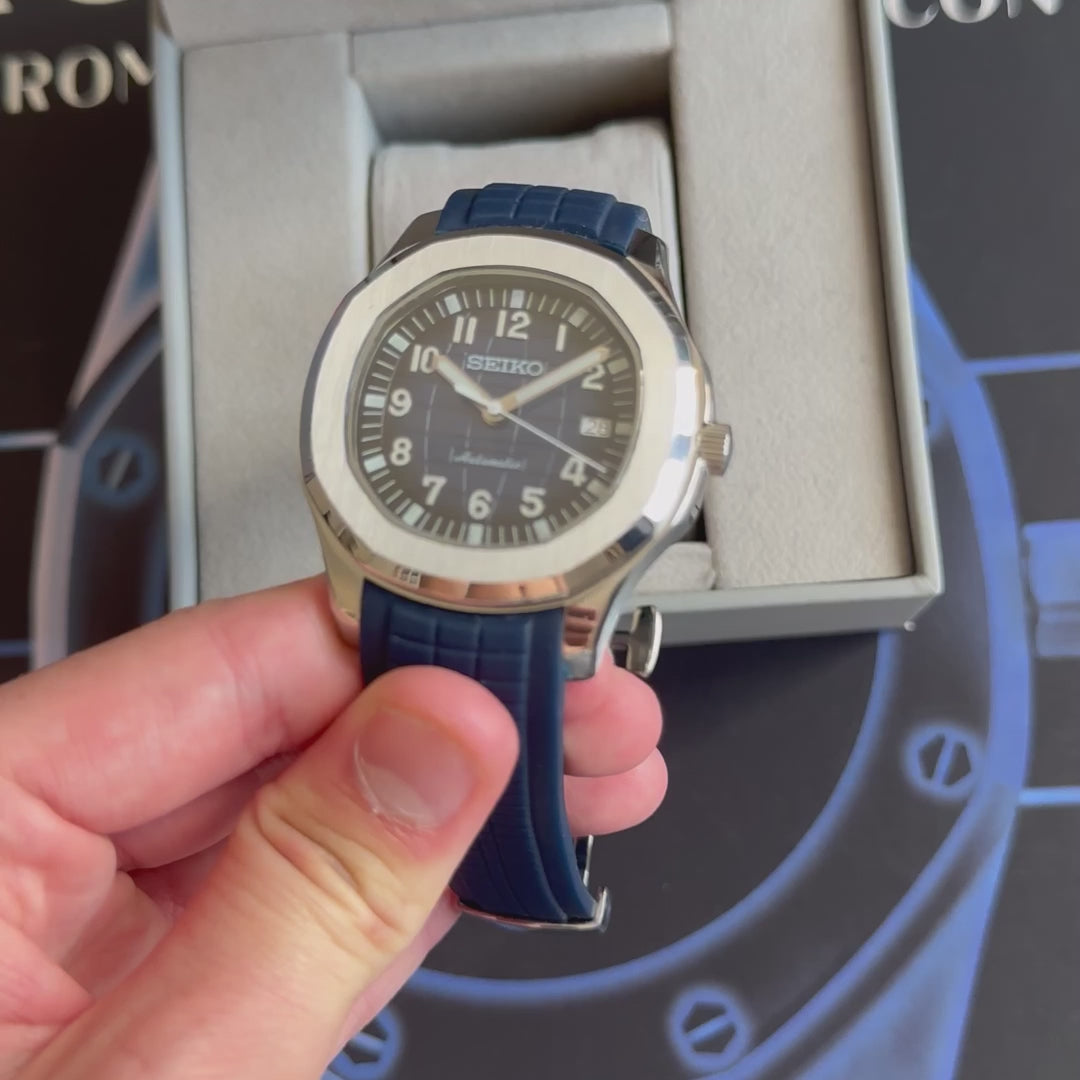 Son cadran texturé, quadrillé comme les cartes maritimes des grands explorateurs, capte la lumière avec subtilité. Associé à un bracelet bleu profond, il évoque le luxe discret des navigateurs modernes, ceux qui ne suivent pas le temps, mais le domptent.